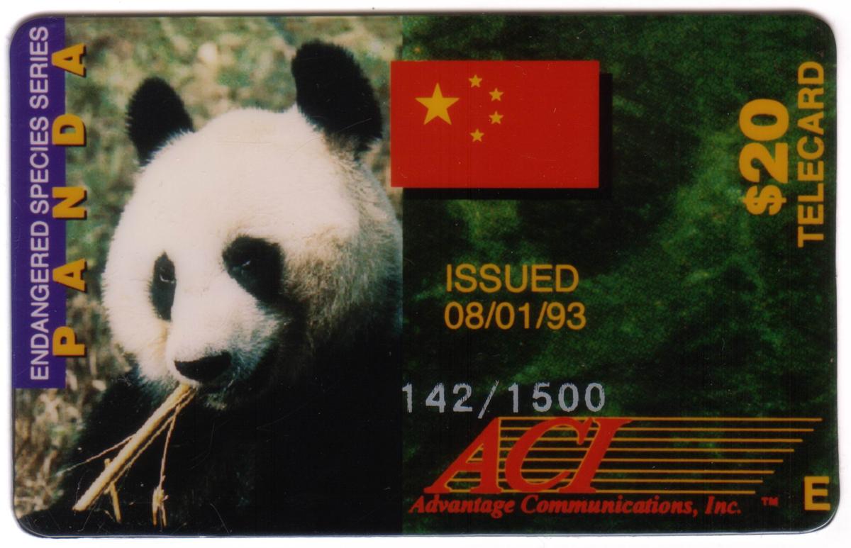 A prominent Chinese flag appears in the top left corner, reinforcing the card’s connection to China. The words "Giant Panda Endangered Species & Chinese Flag" are printed clearly on the card, together with the acronym "ACMI," which is visible in the lower right corner. The denomination of the card is $20, displayed in white numbers with a bright, easily readable font.