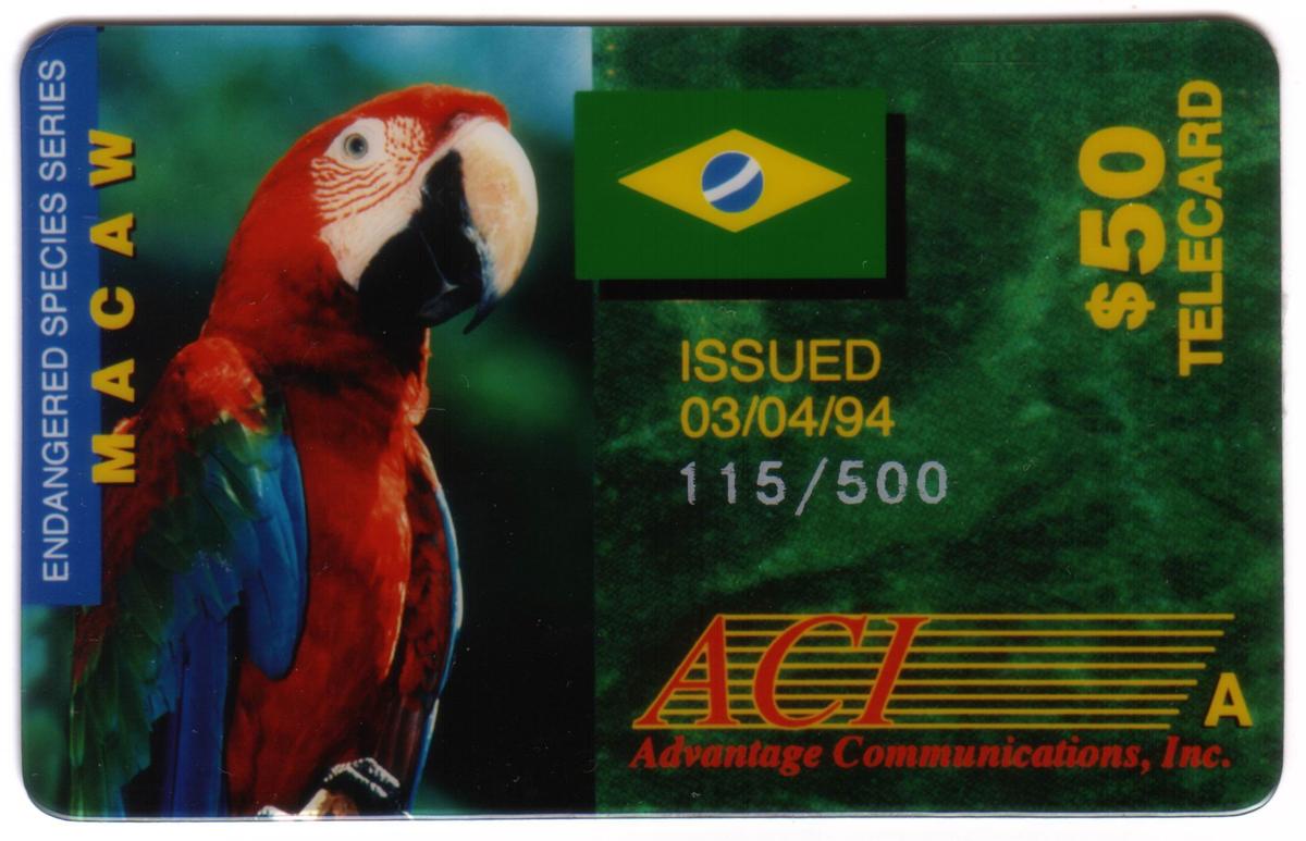 The overall layout is clean and balanced, emphasizing the importance of wildlife conservation, particularly the macaw, which is native to Central and South America. This card combines elements of natural beauty and collectible identification, making it a unique piece dedicated to highlighting endangered bird species.