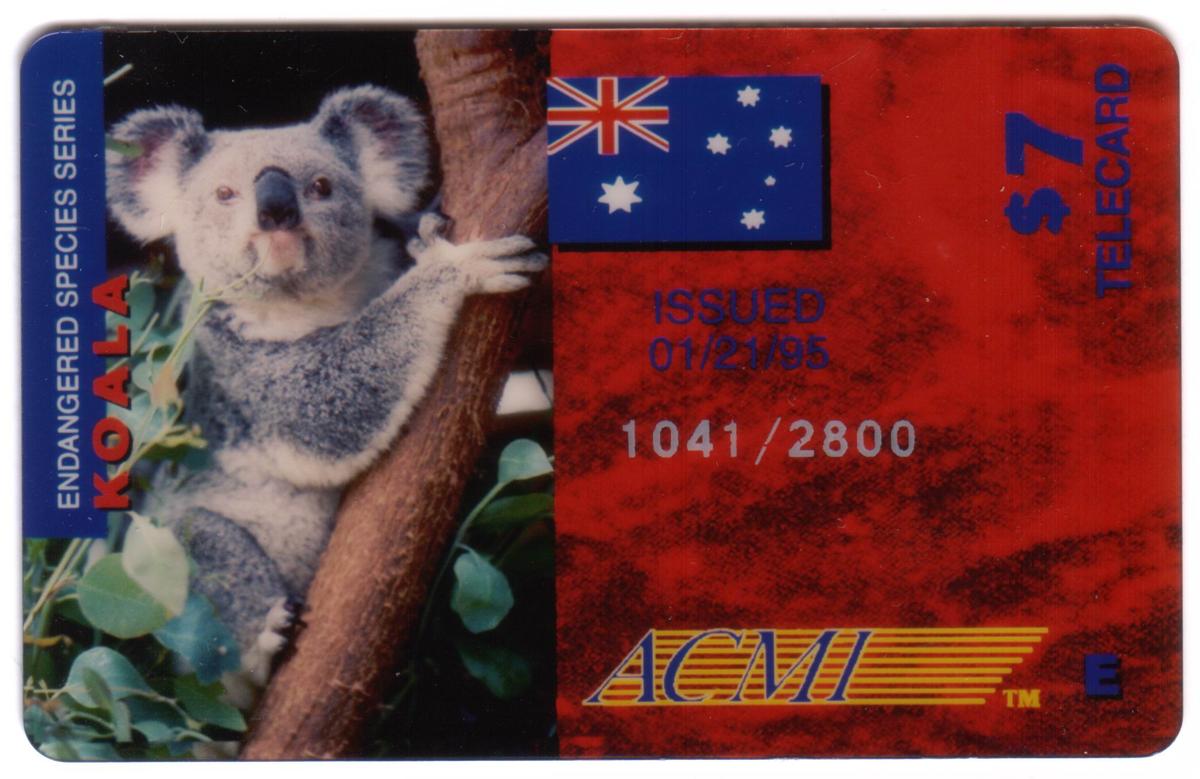 The card is associated with ACMI (Australian Centre for the Moving Image), as indicated by the logo or text appearing on the lower part of the card. This collectible phone card blends themes of endangered species awareness and Australian wildlife, with the koala bear as the central focus alongside symbols of international unity.