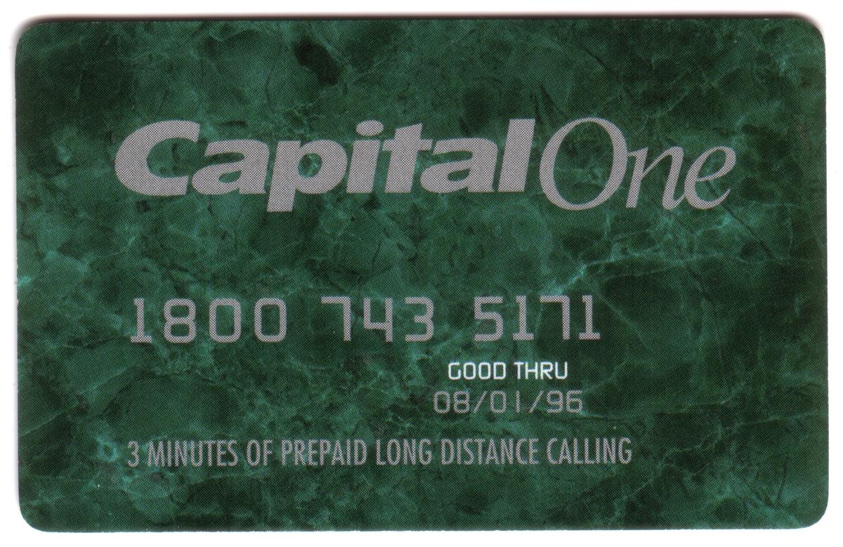 Capital One logo on a dark green marble background, with access number, expiration date, and 3 minutes of prepaid long-distance calling.