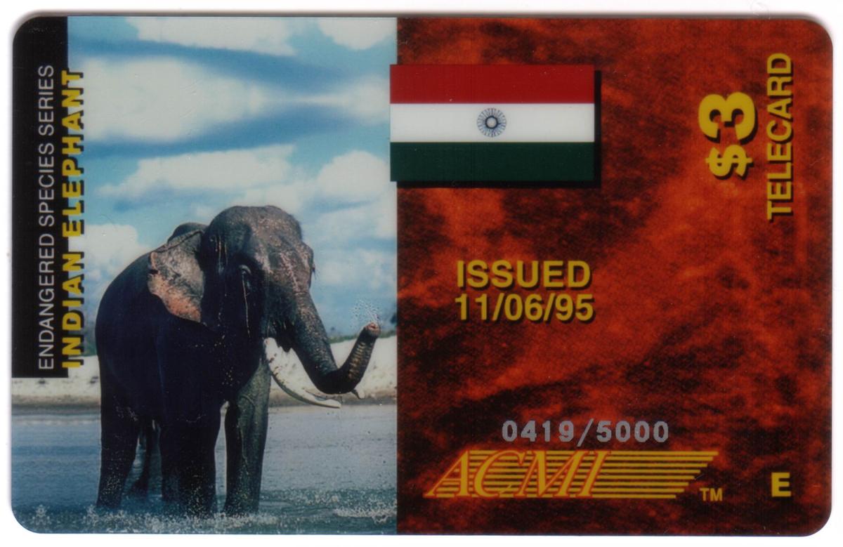 Indian elephant wildlife-themed phone card featuring endangered species, Indian flag, limited edition serial number, and vibrant conservation imagery.