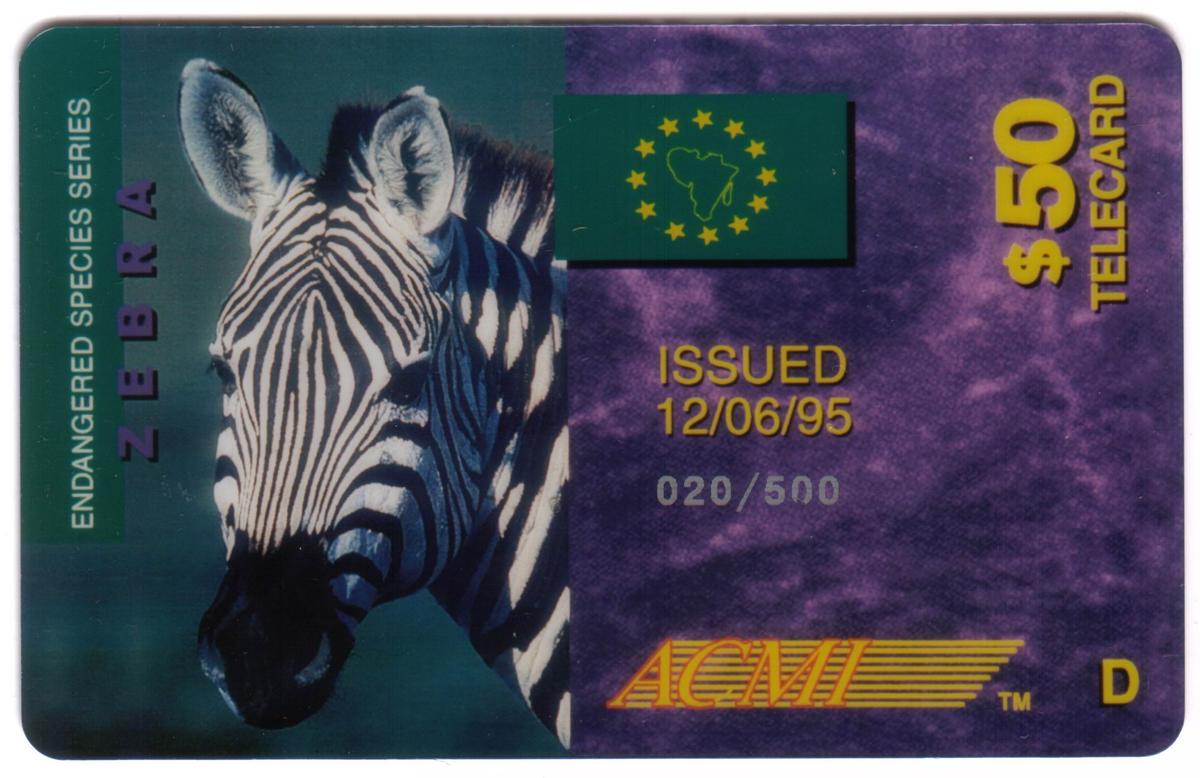 At the top left corner, the card displays the denomination of "$50" in bold green and yellow font. The title "Zebra Endangered Species" is printed clearly, associating the image with a broader wildlife preservation theme. The acronym "ACMI" is also present on the card, which refers to African Collectors Mint International.