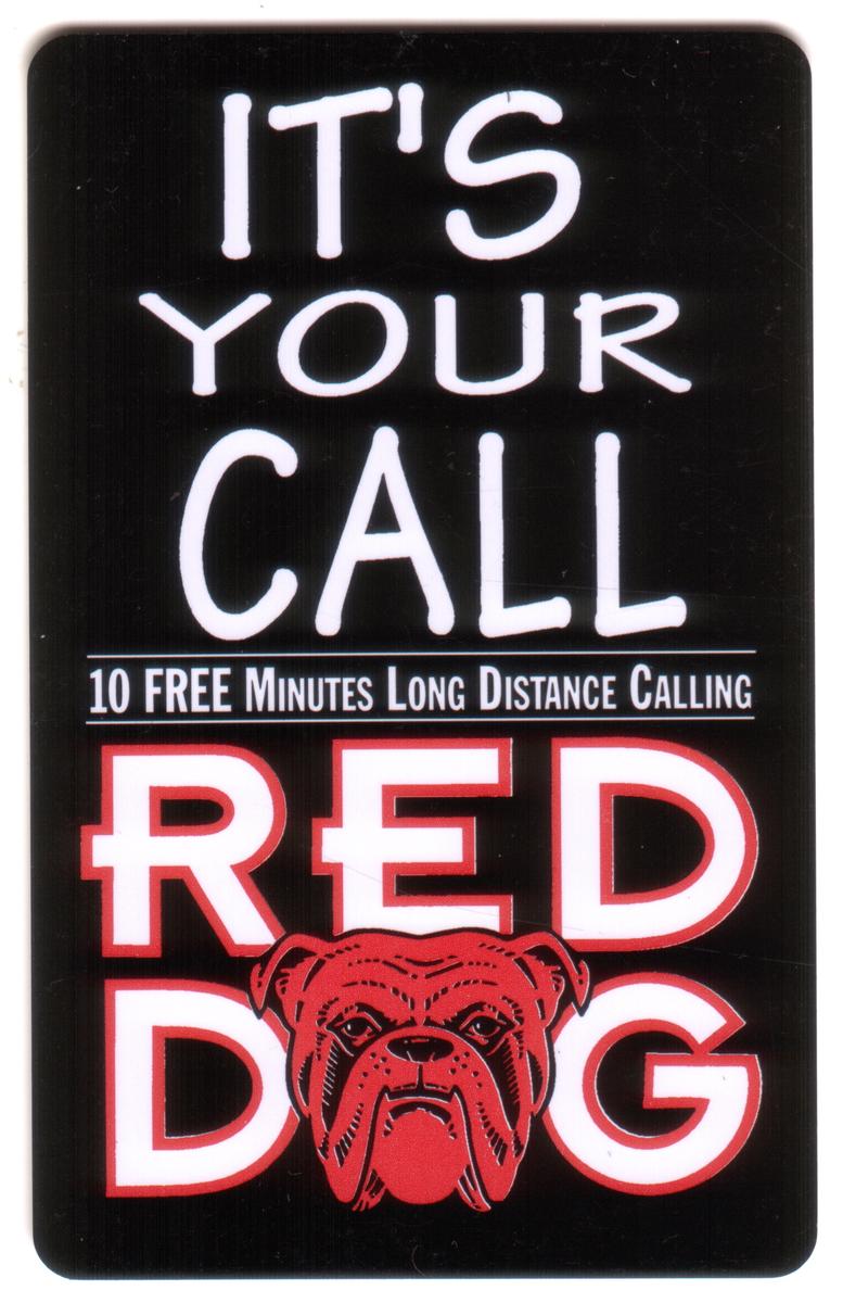 This card is linked to promotional communications design, specifically advertising Red Dog Beer, a well-known product in the alcohol category. The card is intended to provide 10 free minutes of long-distance calling, making it a functional yet branded collectible phone card.