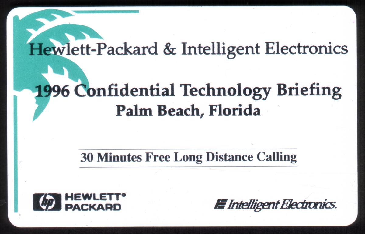 The context of this card is focused on technology and corporate business matters, particularly a 1996 technology briefing in Palm Beach, Florida, which ties together Hewlett-Packard and Intelligent Electronics. The card is a collectible piece connected to these organizations and that specific event, representing a slice of corporate technology history from that period.