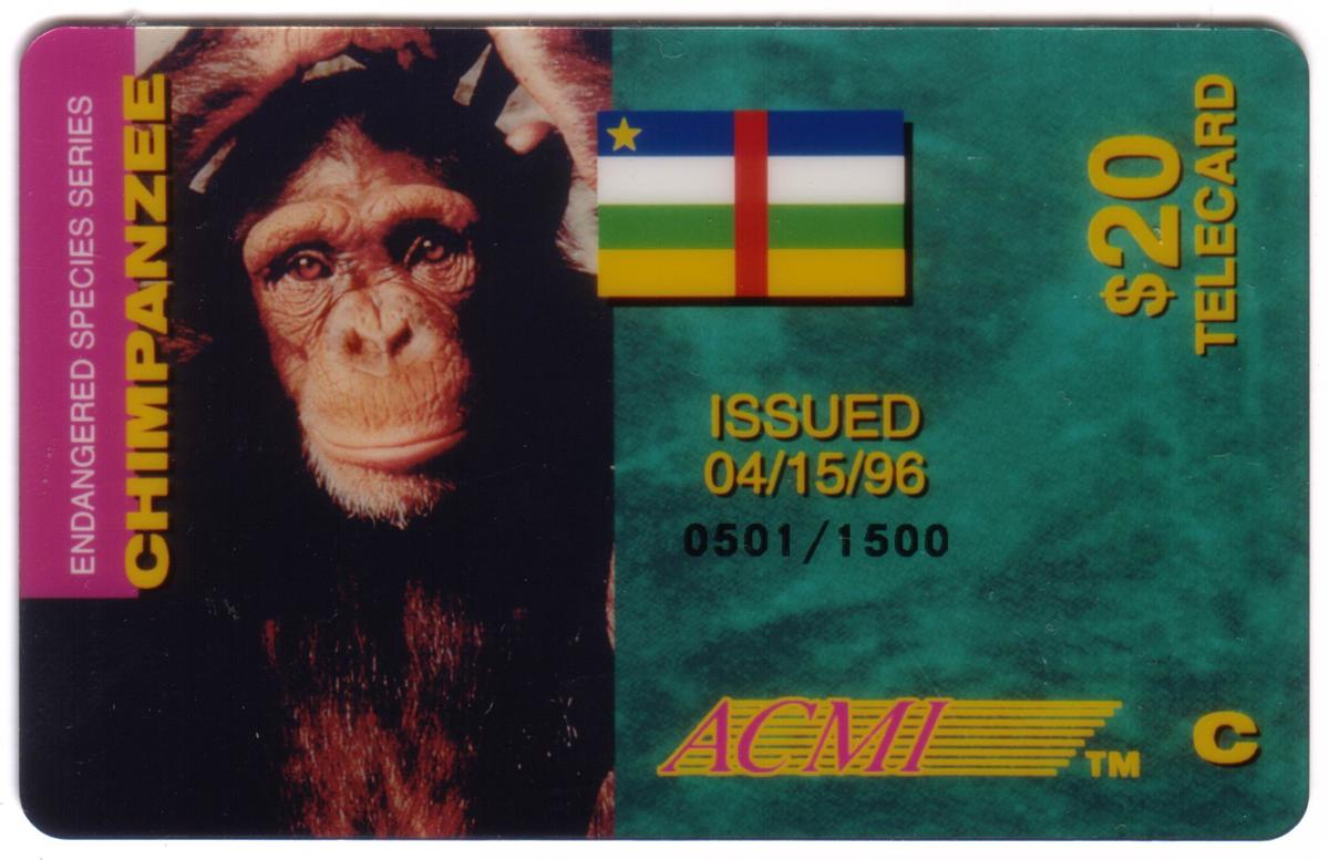 Endangered species series phone card featuring a chimpanzee''s face, Central African Republic flag, vintage date, limited edition serial, and $20 denomination.
