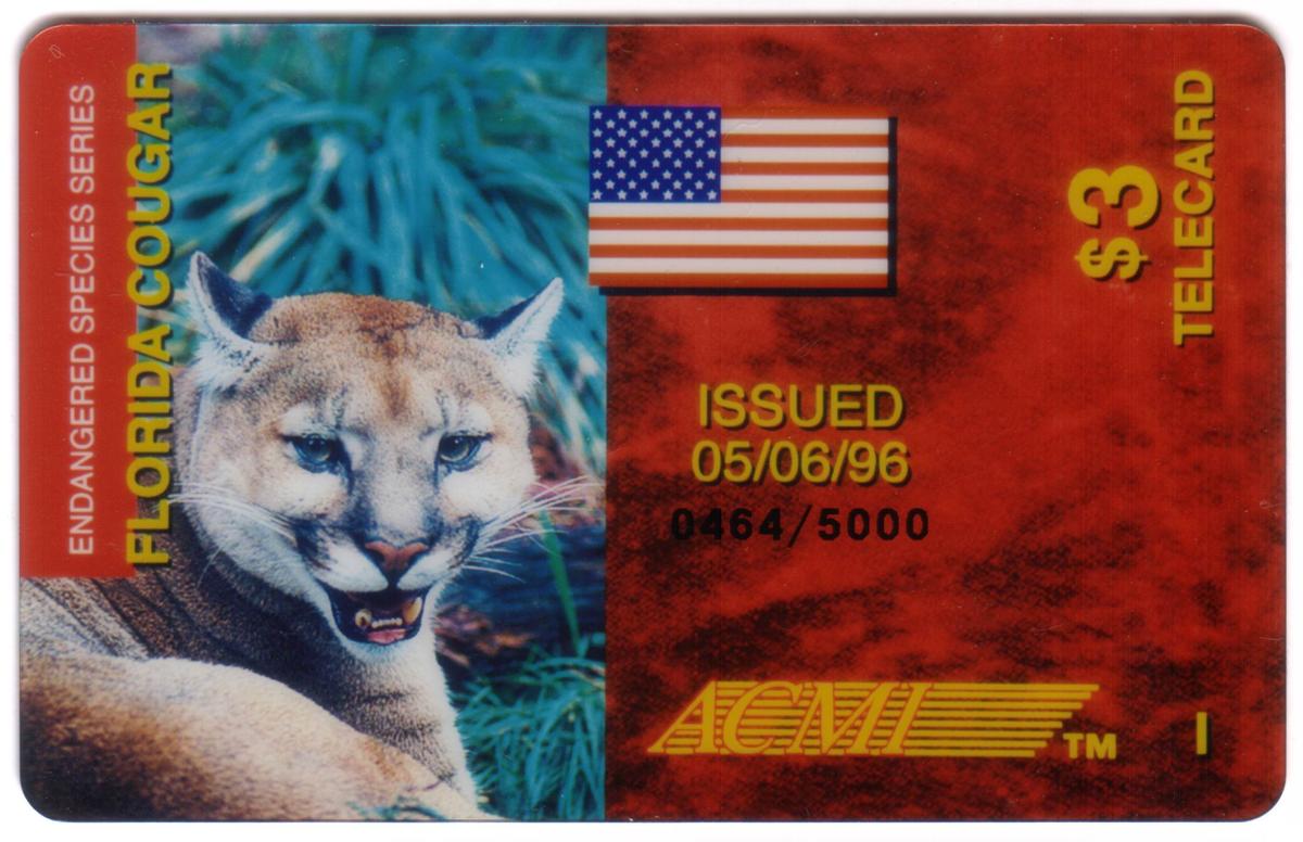 Text on the card includes the label “Florida Cougar Endangered Species (‘I’) & USA Flag” as well as the acronym "ACMI," indicating the issuing authority or organization tied to the card. The card’s denomination is $3, shown clearly in an upper corner, designating its value. The composition balances wildlife imagery with patriotic elements, creating a visually striking piece that celebrates both nature and nation.