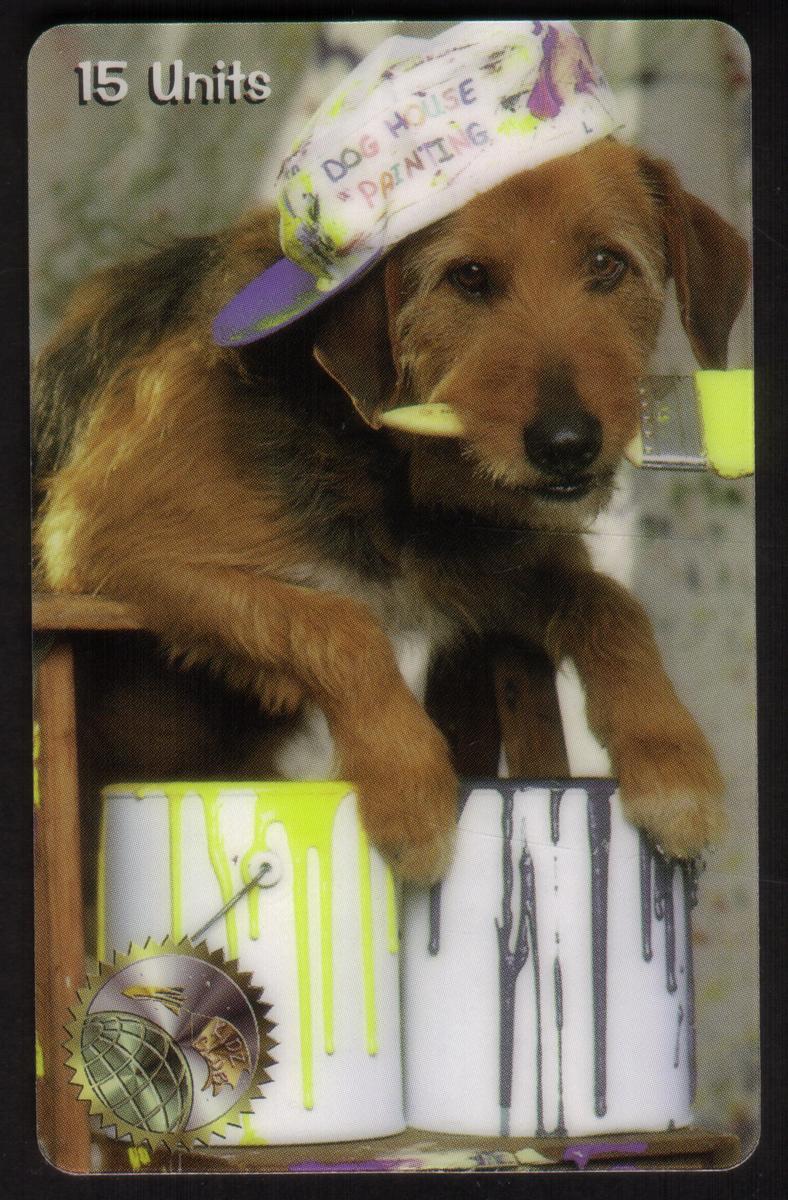 The colors in the artwork are vibrant and arranged to highlight the dog and the painting tools. The background is neutral, allowing the main elements—the dog, the paintbrush, and the painting supplies—to stand out clearly. The card’s design blends a sense of humor with the theme of art and pets, creating a memorable and unique collectible phone card.