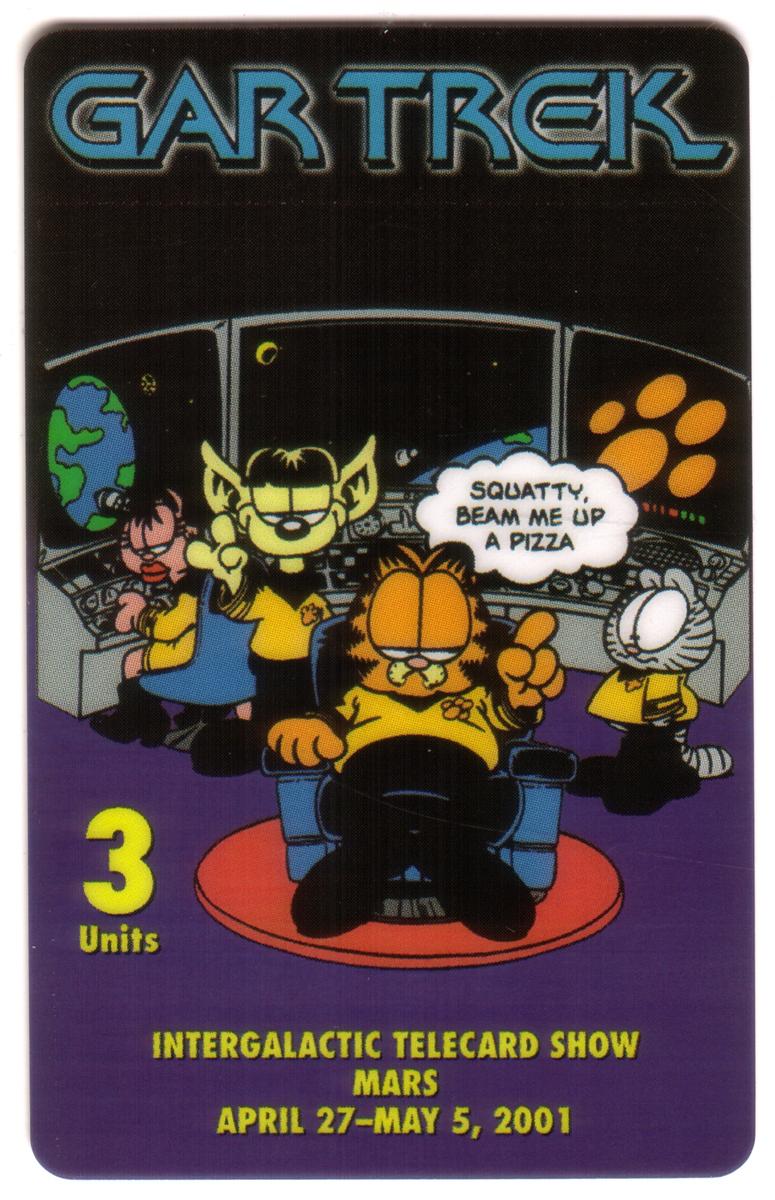 This collectible phone card features Garfield the Cat in a science fiction-themed design titled "Gar Trek" InterGalactic Telecard Show from Mars, 2001. Garfield is depicted as an animated cartoon character in a space setting, wearing a futuristic outfit reminiscent of a space explorer or starship crew member. The artwork includes vibrant colors and stylized cartoon elements consistent with the Garfield comic strip and animation style.