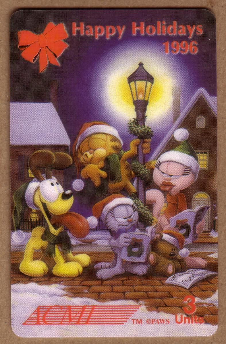 This collectible phone card features Garfield the Cat dressed as a Christmas caroler along with two other characters from the Garfield series. All three are wearing festive holiday attire, including scarves and Santa hats. Above the characters, the phrase “Happy Holidays 1996” is prominently displayed in green and red letters, emphasizing the seasonal theme of the card. The background is a cool blue with snowflakes scattered around, enhancing the winter holiday atmosphere.