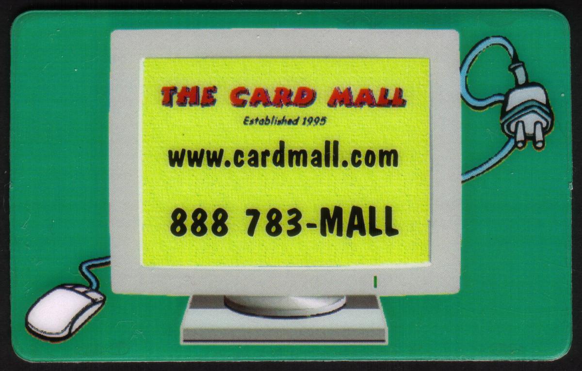 The card prominently includes the branding and logos of Cable & Wireless (CWI) and WorldCom, linking it to telecommunications or computing promotions. Text on the card references “The Card Mall” and “5m,” which may denote the card’s theme or promotional series involving computer accessories or advertising. The overall composition integrates these technology-related visuals to emphasize computer hardware and electronic connectivity under a green-themed backdrop.