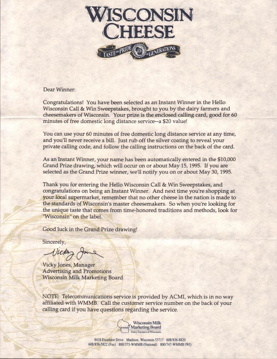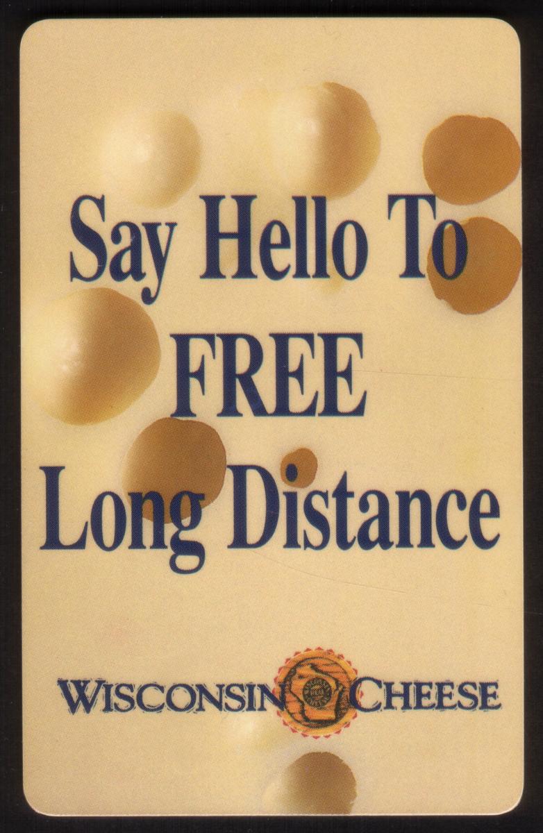 This promotional card is linked to a campaign involving free long-distance phone service, as indicated by the text and the context of Wisconsin Cheese advertising. It is related to the category of promotional cards for corporate trademarks in the dairy industry, highlighting Wisconsin Cheese’s branding efforts.
