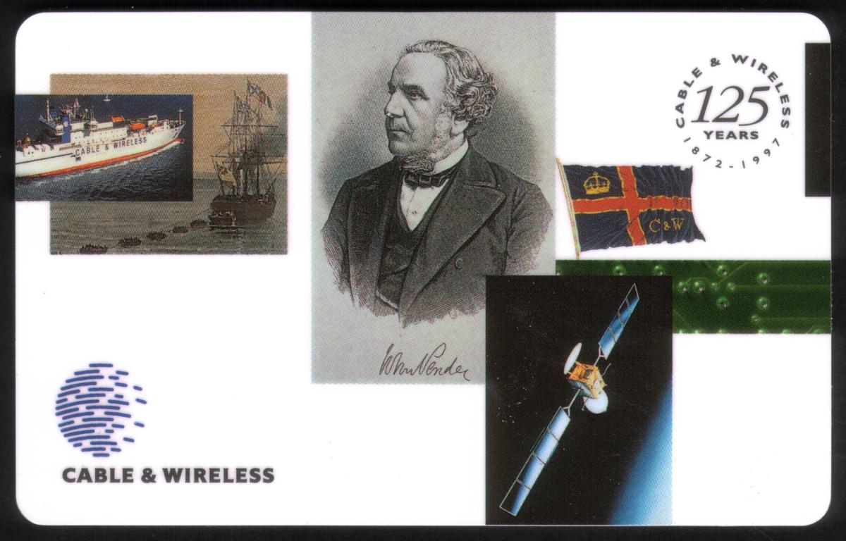 This collectible phone card commemorates the 125th anniversary of Cable & Wireless, dated 1872–1997. It features a collage of images highlighting the history and scope of telecommunications. At the center is a black-and-white portrait of William Pender, a significant figure in the development of Cable & Wireless, with his signature beneath the image.