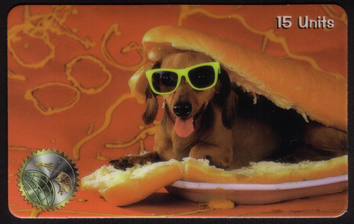 This phone card uniquely combines themes of animals and food with a lighthearted, photographic approach. It showcases a dog as the central figure in a humorous setting, appealing to collectors interested in pet-themed or novelty designs.