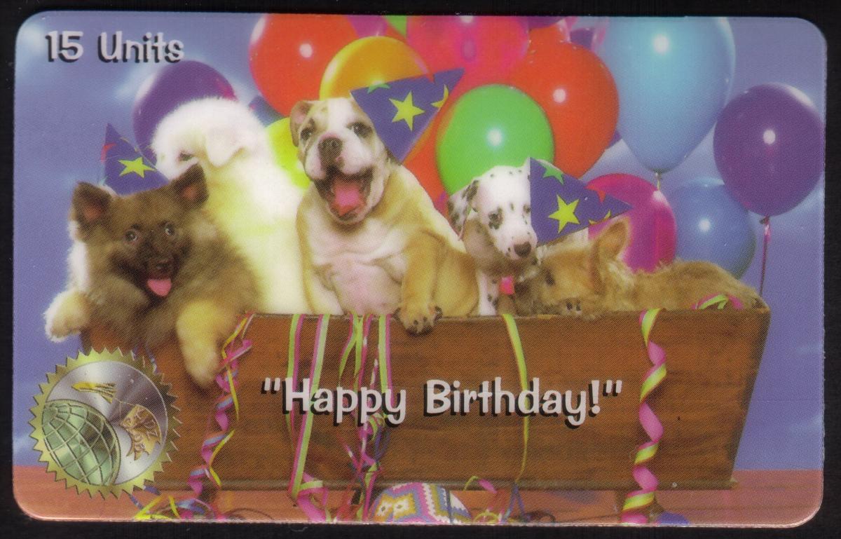 Text on the card identifies the piece as "Dogs With Party Hats & Balloons," and the issuing entity is noted as Destiny Telecomm. Overall, the card presents a cheerful and playful scene combining pets and birthday party elements.