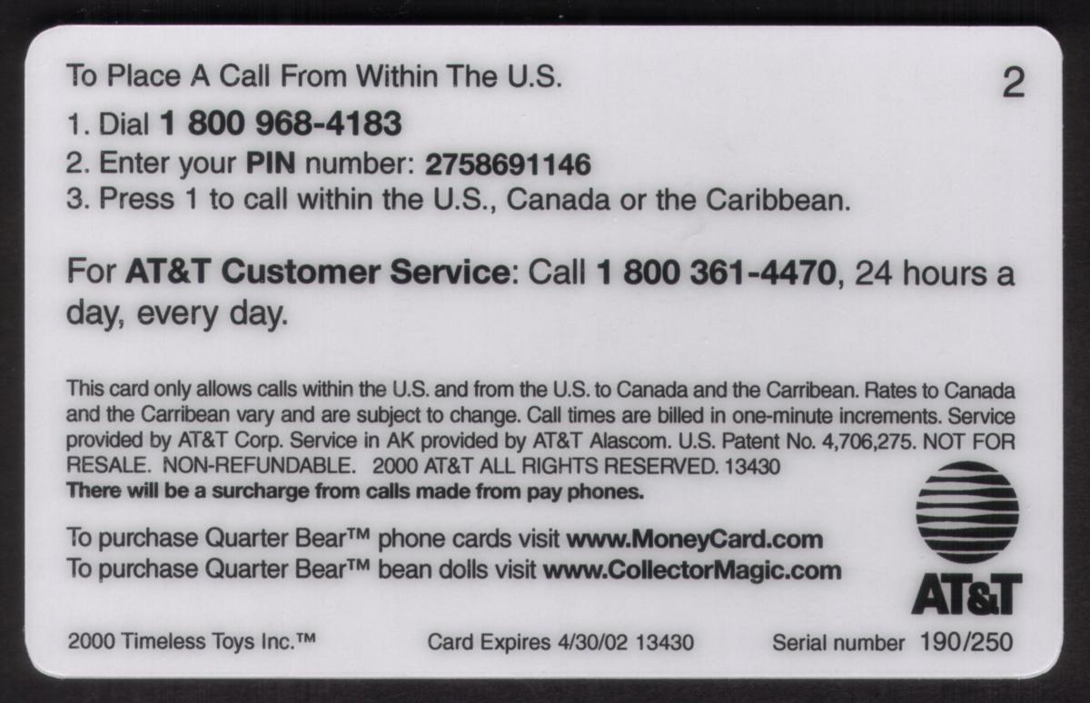 Vibrant Pennsylvania-themed collectible phone card featuring Quarter Bears, patriotic details, state quarter, and 5-minute AT&T calling value. |