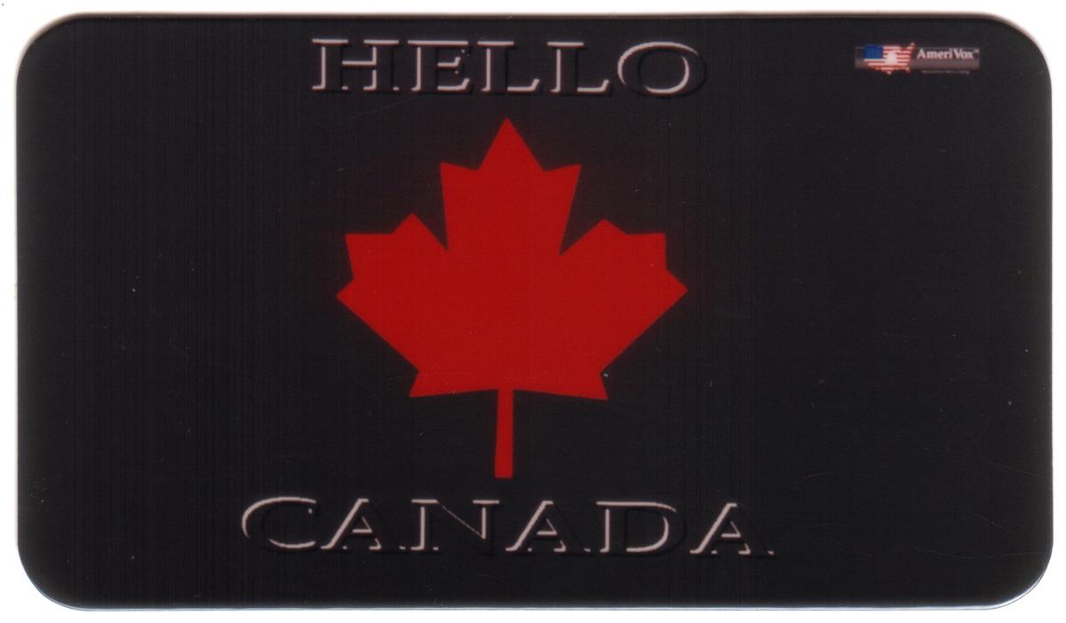 This collectible phone card features a large, bold red maple leaf centered on a solid black background. The word "HELLO" is embossed in uppercase letters above the maple leaf, and the word "CANADA" is similarly embossed below it, both in a clean, sans-serif font. In the top right corner, there is a small graphic of the American flag next to the word "AmeriVox," also embossed, indicating the card’s supplier.