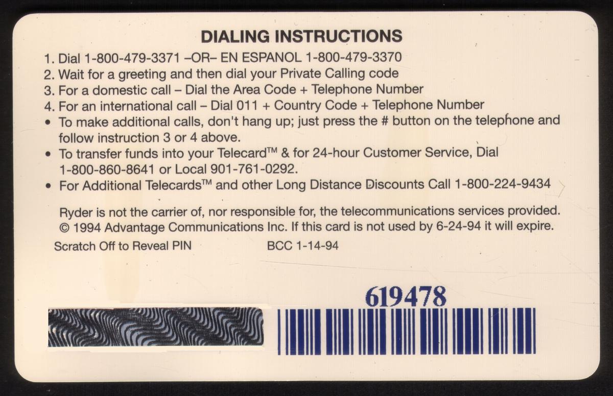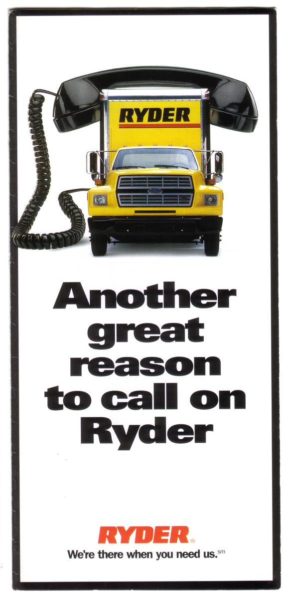 Vintage Ryder Truck Rental promotional set featuring a prepaid calling card, back with dialing instructions, and an ad merging a Ryder truck with a telephone handset.