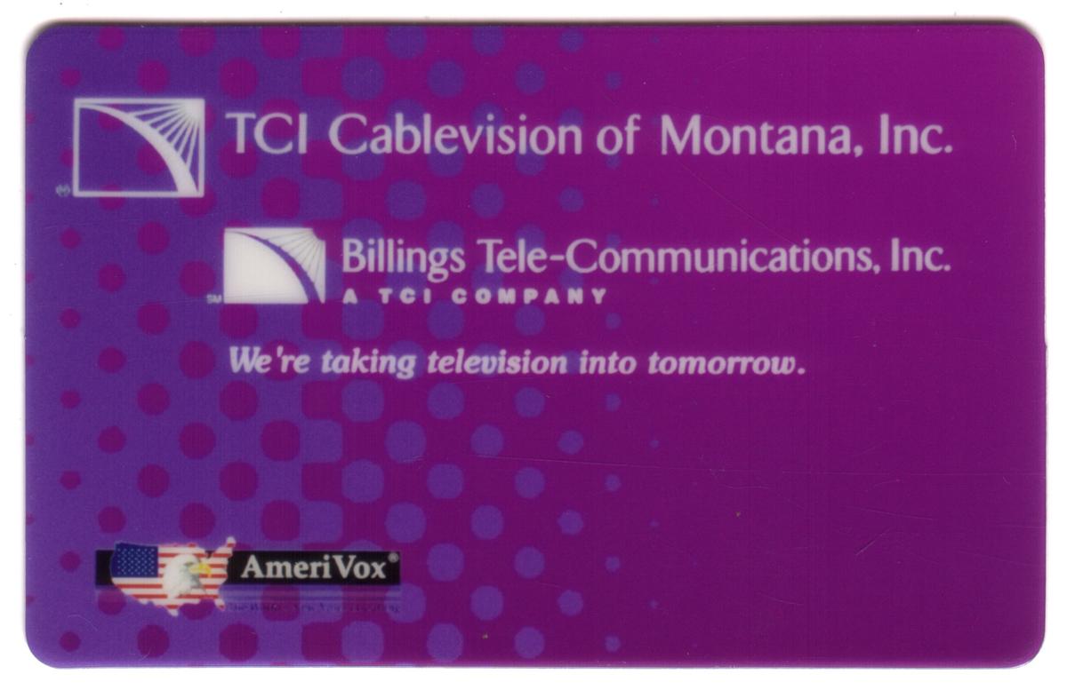 This collectible card features the branding and imagery related to TCI Cablevision of Montana, Inc., also known as Billings Tele-Communications, highlighting their corporate identity in telecommunications and information technology. Prominently displayed on the card is the TCI logo in white, accompanied by the slogan "We're taking television into tomorrow," which emphasizes the company’s commitment to advancing cable television technology. The card’s design includes clean, modern typography with a background featuring digital circuit patterns in shades of blue and teal, reflecting the themes of technology and innovation.