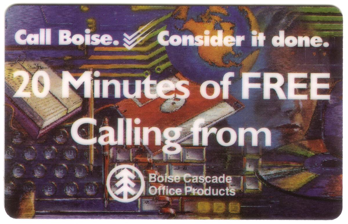 Promotional card featuring Boise Cascade Office Products with 20 minutes free calling, vintage office imagery, logo, and messaging for office and communication solutions.