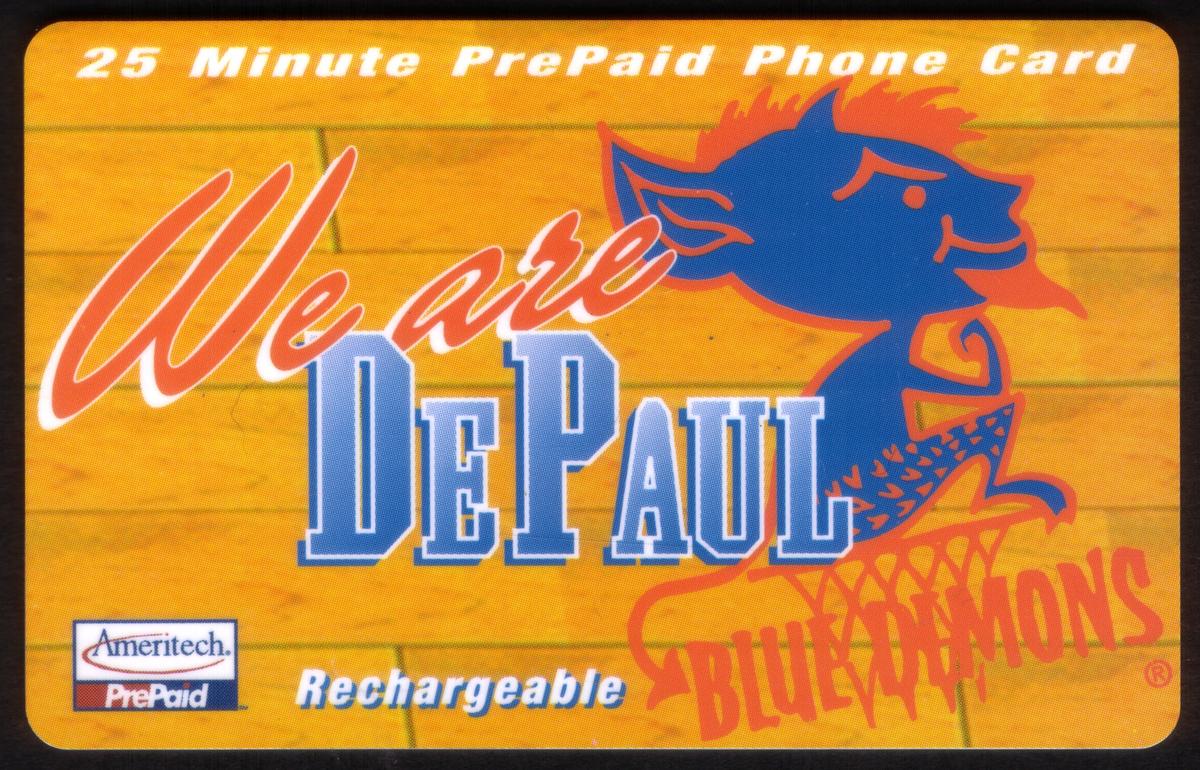 This collectible phone card features a basketball design highlighting DePaul University athletics. The card prominently displays the name "DePaul University Blue Demons Basketball" alongside a large illustrated basketball. The background includes various sports-related imagery, reinforcing the basketball theme connected to the university’s sports teams. The card is numbered "SPECIMEN," indicating it is a sample or promotional item.