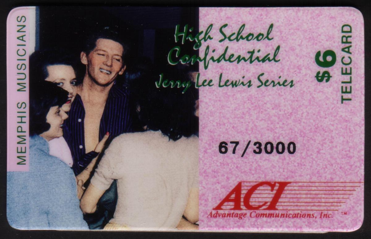 This collectible phone card features a vibrant design focused on 1950s Americana entertainment and rock and roll music. The central artwork depicts a lively bandstand scene with musicians performing, evoking the energetic spirit of that decade. Prominently featured is Jerry Lee Lewis, a legendary rock and roll artist, associated here with the title "High School Confidential." The card highlights the cultural significance of 1950s music and includes visual elements such as instruments and stage lighting that reinforce the musical theme.