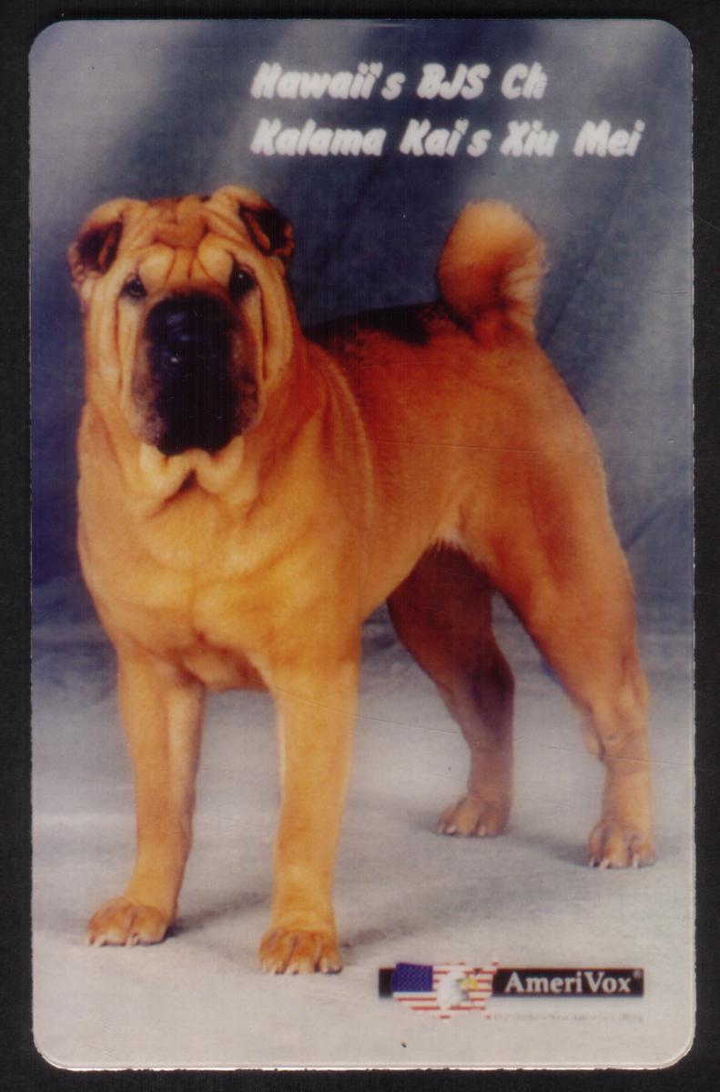 Hawaii champion Shar-Pei Kalama Kai’s Xiu Mei phone card featuring a detailed image, breed traits, and Hawaiian pride, ideal for collectors and dog enthusiasts