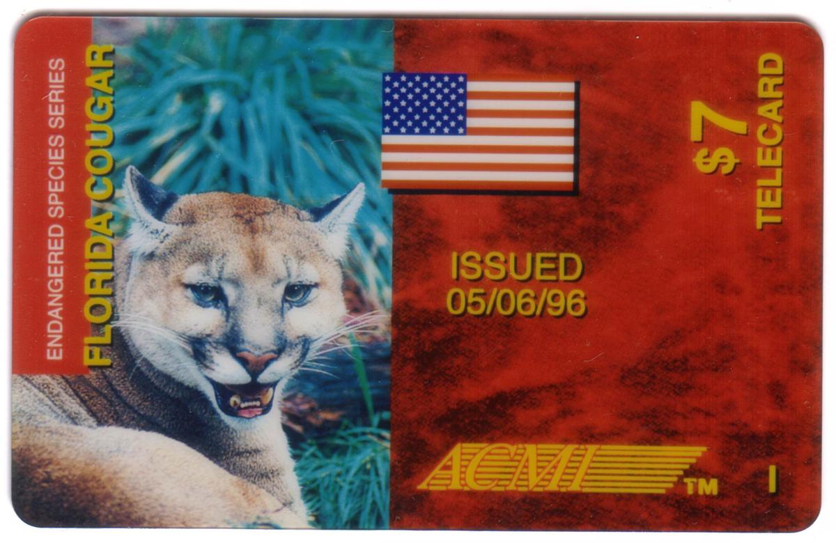 This collectible card features a detailed image of a Florida Cougar, a large feline species native to North America, set against a natural background. The cougar is prominently depicted in a lifelike and dynamic posture, highlighting its muscular build and tawny fur typical of the species. The animal’s eyes are clearly visible, emphasizing the wild and intense nature of this endangered species.