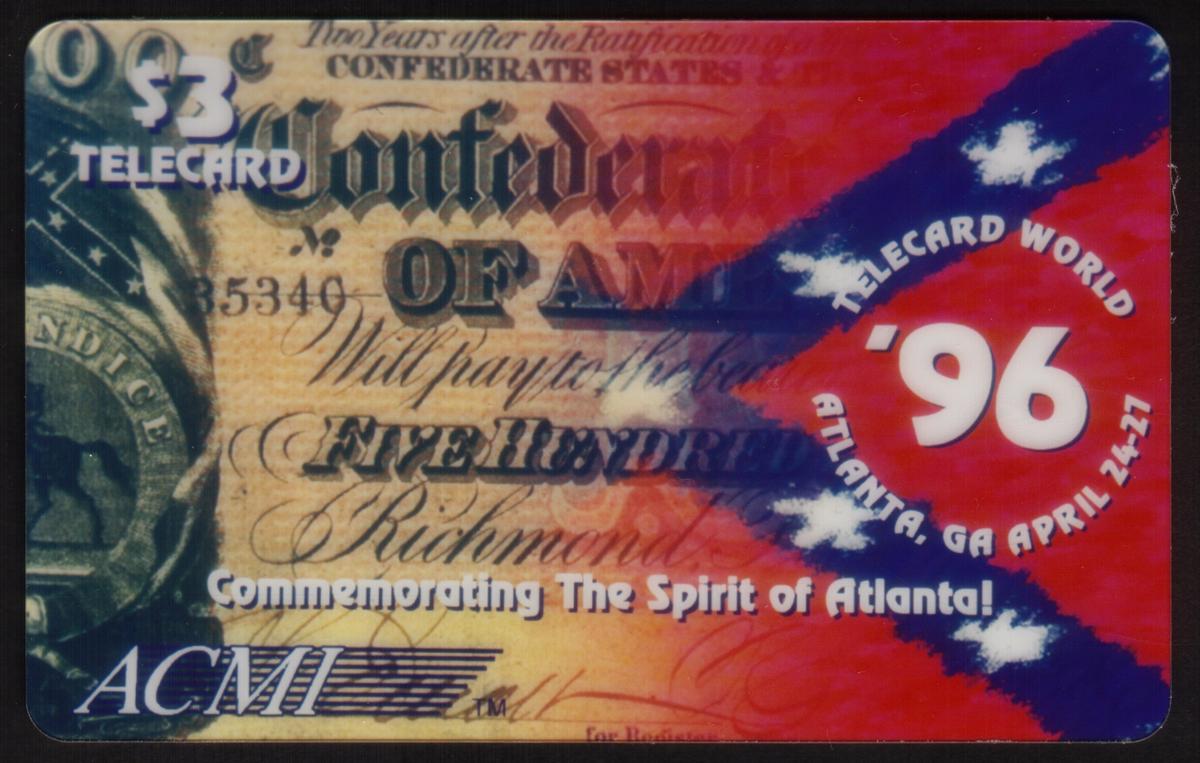 Overall, the card visually emphasizes Civil War symbols, including the Confederate flag and currency, tying these elements together under the TeleCard World 1996 event branding from Atlanta, Georgia. It serves as a collectible item representing a piece of United States history and politics through the lens of telecommunication memorabilia.
