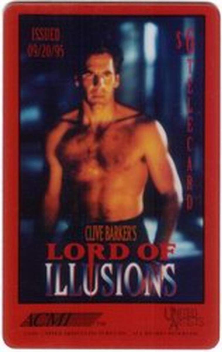 This collectible chip card features imagery from the 1995 horror film *Lord of Illusions*, directed by Clive Barker. The card prominently displays the character Harry D’Amour, portrayed by Scott Bakula, a key figure in the movie. The artwork blends themes of magic, fantasy, and illusionism, reflecting the film’s blend of horror and supernatural elements. The card includes the title *Lord of Illusions* and references Clive Barker’s horror film on its face.