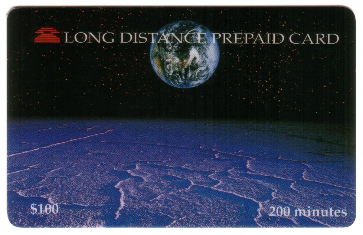 The card includes references to “LDDS WorldCom” in text, linking it to the telecommunications company WorldCom. It is a prepaid card with a $100 value for long distance calls, carrying a 200-minute allowance. The design highlights themes of space exploration, featuring outer space, planets, Earth, and moons as central visual elements. The overall presentation captures a moment of Earthrise, celebrating human connectivity across vast distances.