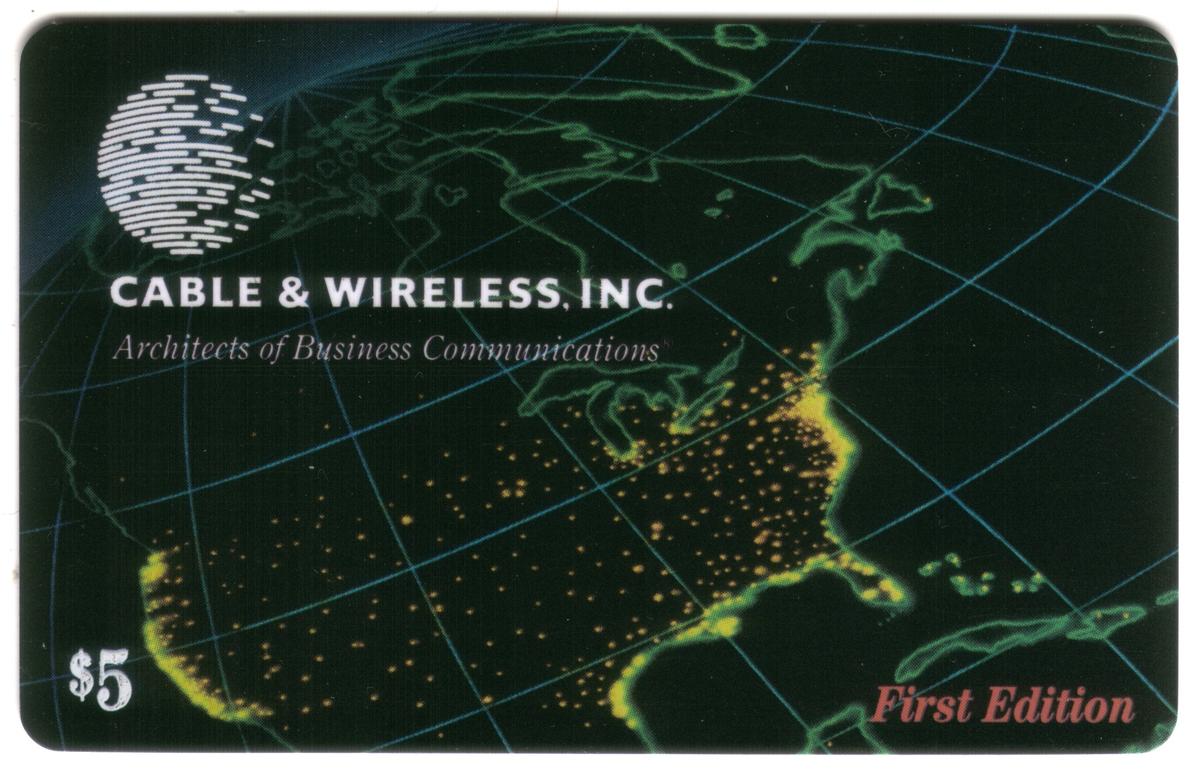 The overall presentation integrates business communications branding with geographic elements. The card’s combination of the illuminated globe, the map of the USA, and corporate text reflects a clear promotional intent tied to Cable & Wireless (CWI), positioning it as a collectible piece related to telecommunications and global connectivity.
