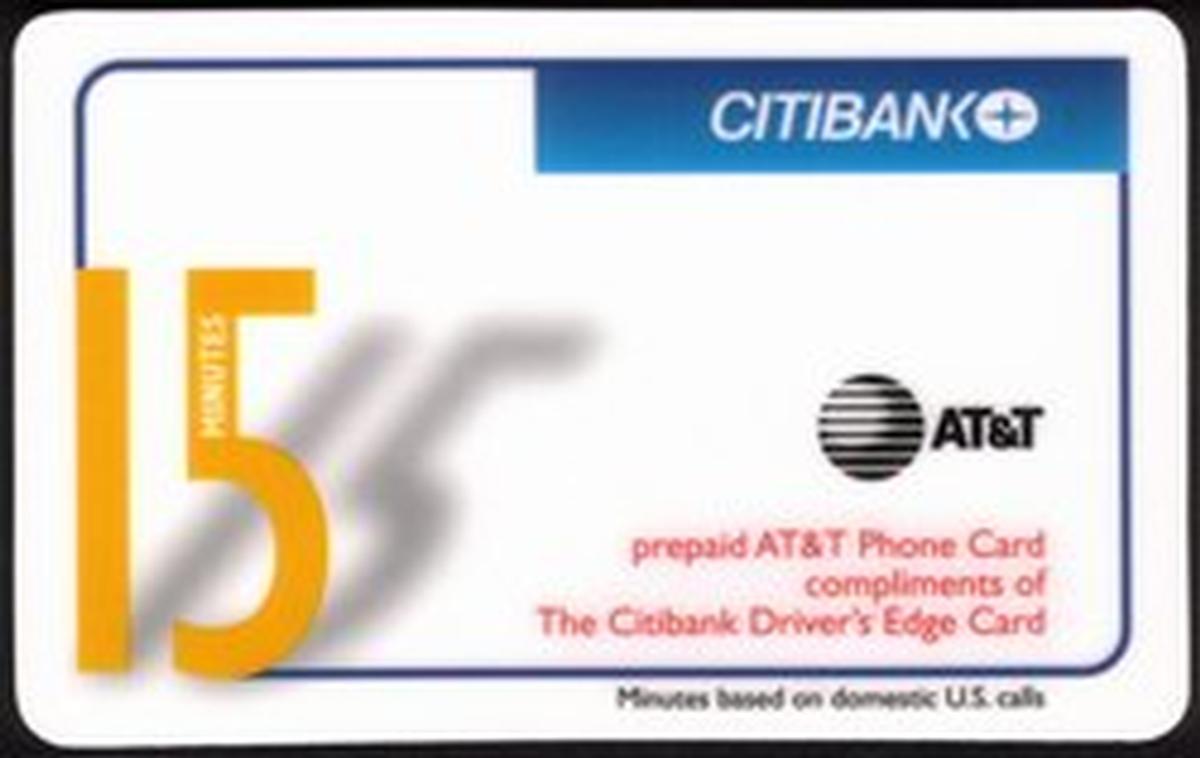 This card represents a financial services promotional item related to Citibank, connected to AT&T and featuring a 15-minute value. The use of the term "Driver's Edge Card" and the racing helmet suggests a theme centered around driving or racing, supporting the card's promotional nature. The clean layout and inclusion of official logos tie it directly to Citibank and AT&T branding.