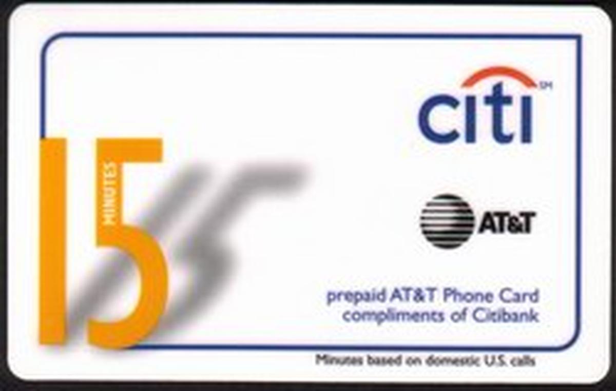 The card’s design includes a clean white background with a faint watermark-like pattern made up of the Citi arc symbol, reinforcing the corporate branding. "15m" is clearly printed on the card, specifying the value or balance associated with its use. The card's text displays relevant corporate and service names such as "Citibank," "Citi," and "AT&T," all arranged neatly on the front side, with specific attention to fonts and spacing that align with their respective brand identities.