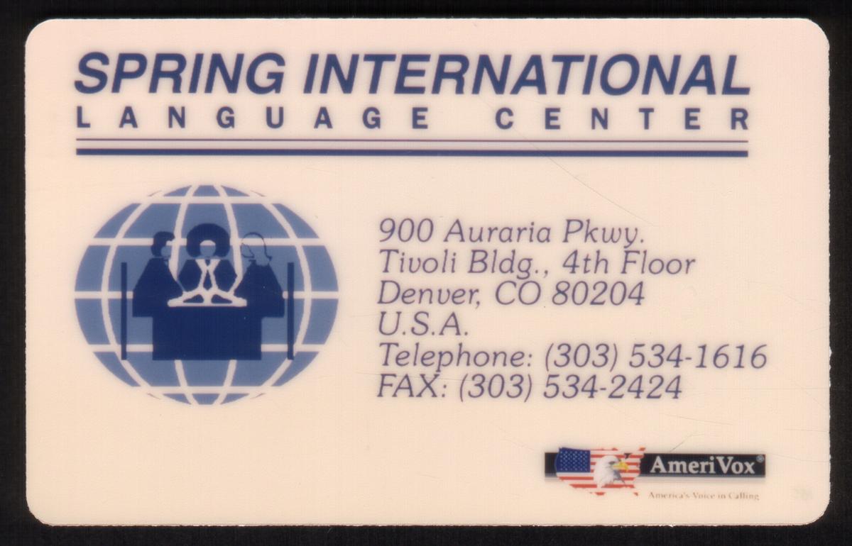 This collectible phone card features the Spring International Language Center from 1994, located in Denver, Colorado. The design includes the center’s logo prominently displayed alongside vivid graphics associated with international education and language learning. The card is marked with the name "AmeriVox," indicating the issuer or related company.