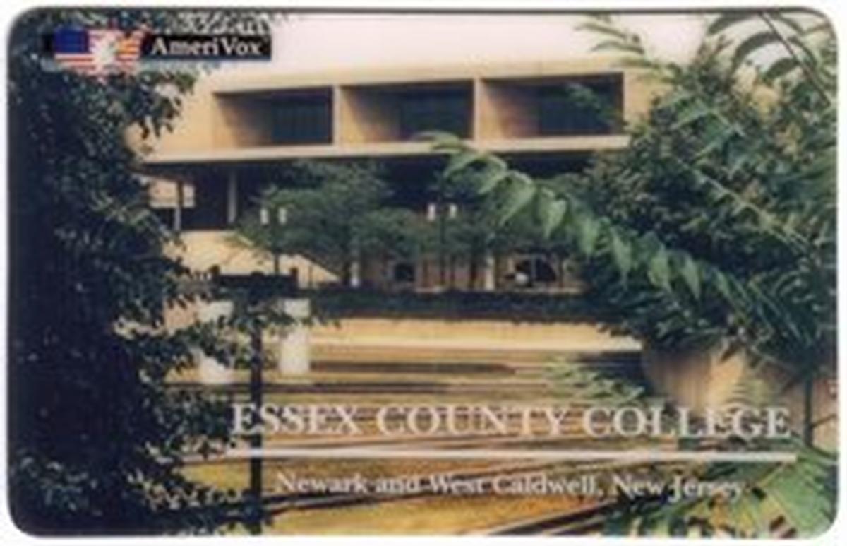 This collectible phone card features imagery representing Essex County College, a public community college located in Newark and West Caldwell, New Jersey. The card prominently showcases architectural views of the college buildings, displaying the distinctive structures associated with the campus. The design emphasizes the modern style of the college's facilities under natural daylight conditions.
