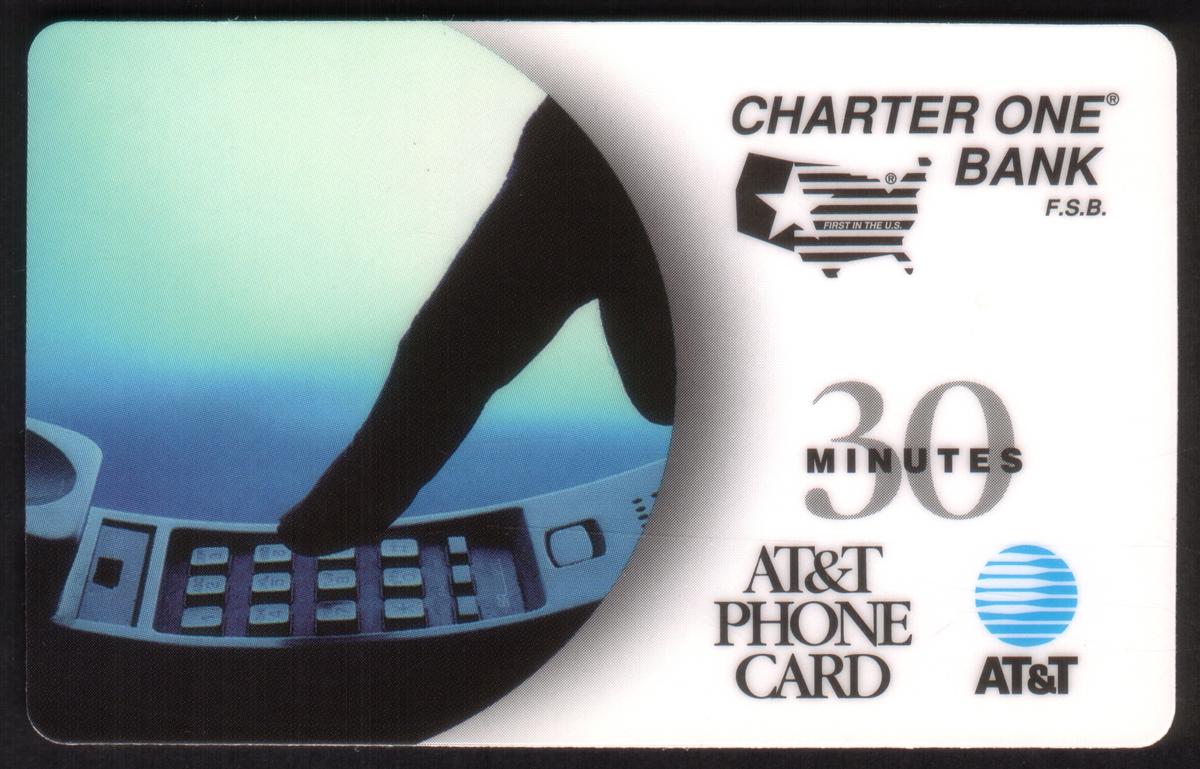 In terms of design, the card uses a clean layout with the key visual elements—the FSB logo, Charter One Bank name, and AT&T branding—well balanced. The background is primarily white with accents of blue and black text, giving it a professional and corporate look consistent with banking and telephone card promotions. The card is promotional in nature, designed to represent financial institutions such as the Federal Savings Bank and Charter One Bank, while also serving a telephone calling function through AT&T’s network.