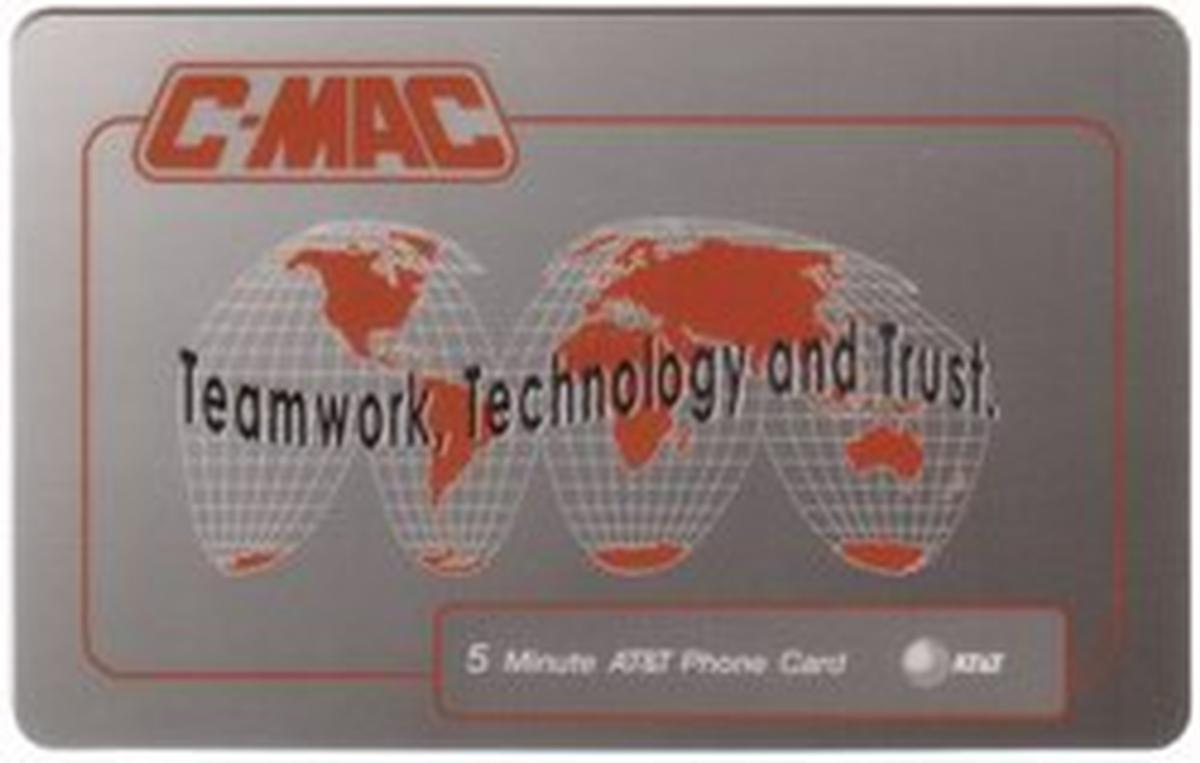Promotional 5-minute C-MAC card featuring a metallic silver background, world map, orange globes, and bold slogan emphasizing teamwork, technology, and trust.