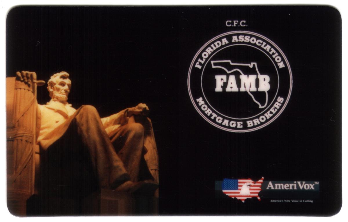 At the top center of the card, there is a circular logo that reads "C.F.C. Florida Association Mortgage Brokers" surrounding the acronym "FAMB" inside an outline of the state of Florida. The logo is white, standing out clearly against the dark background.