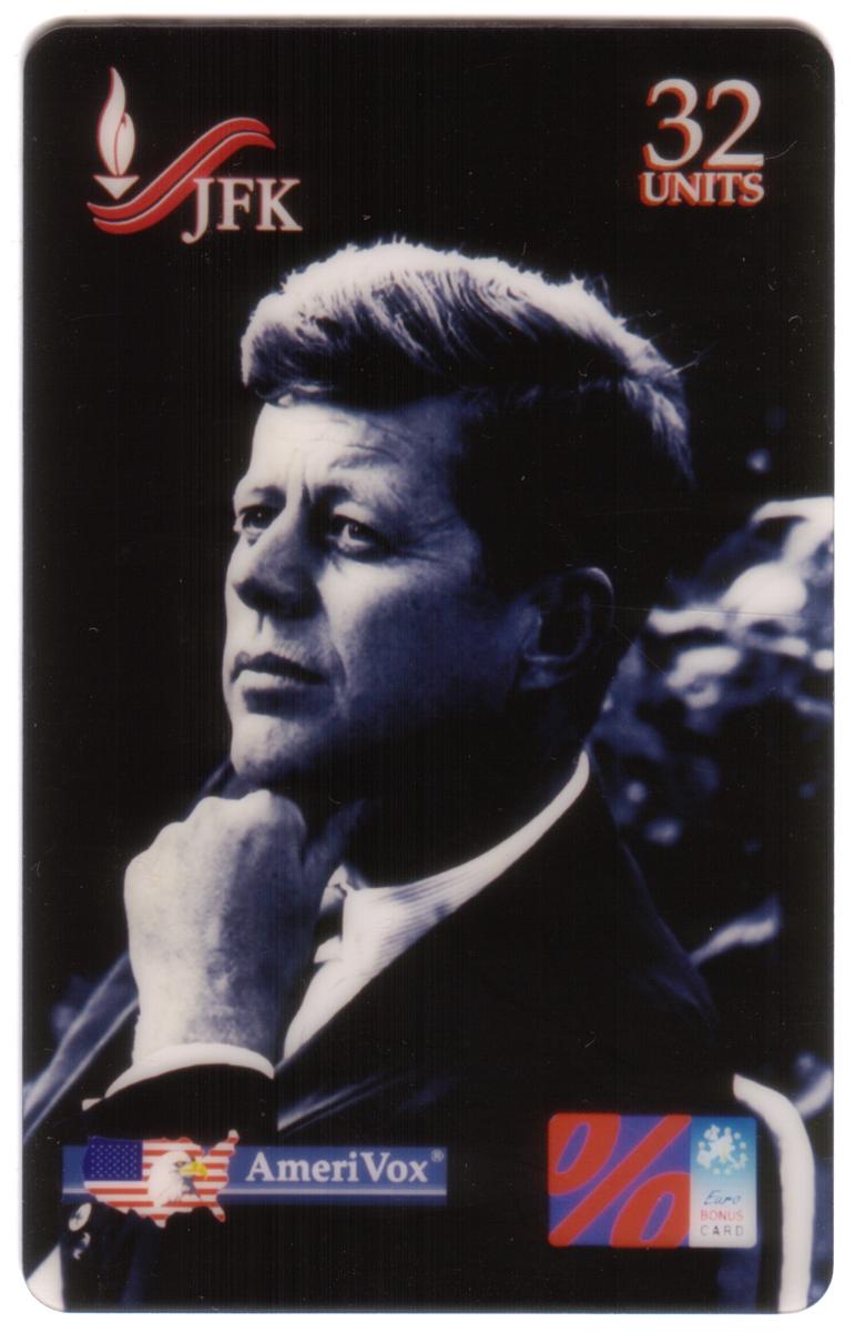 Black-and-white JFK portrait phone card with 32 units, patriotic symbols, and historic imagery honoring President Kennedy''s legacy and leadership. |