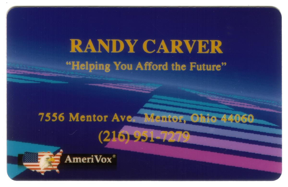 Overall, this collectible phone card serves as a promotional piece linking Randy Carver’s financial and investment advisory services with AmeriVox’s telecommunications network, targeting clients in Mentor, Ohio. The informative text and logos provide a direct, factual presentation of the card’s purpose and affiliations.