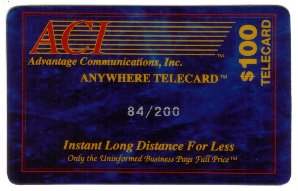 This collectible telecard prominently displays the Advantage Communications Corporate Anywhere Telecard logo in bold lettering. The card background features a gradient of blue shades, creating a sleek and modern appearance. "Instant Long Distance for Less" and "Prepaid Flex'net $100" are clearly printed, indicating its prepaid calling value and purpose for long-distance communication. The Advantage Communications name is highlighted to emphasize corporate telecommunication services.