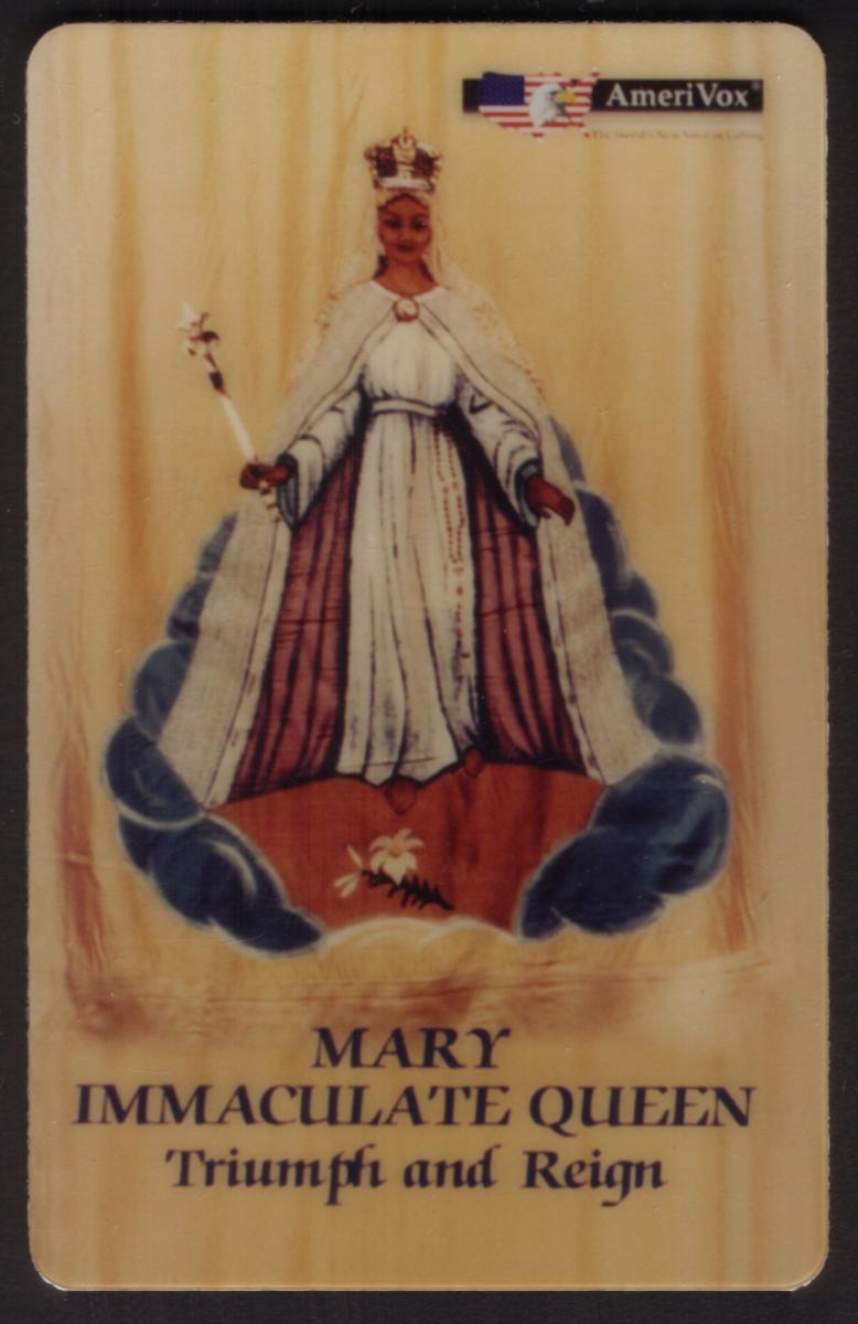 The card includes the text "MARY IMMACULATE QUEEN" prominently displayed beneath the image, followed by "Triumph and Reign" in a smaller font. Toward the upper right corner, the AmeriVox logo appears alongside a small American flag icon, indicating the card’s publisher.