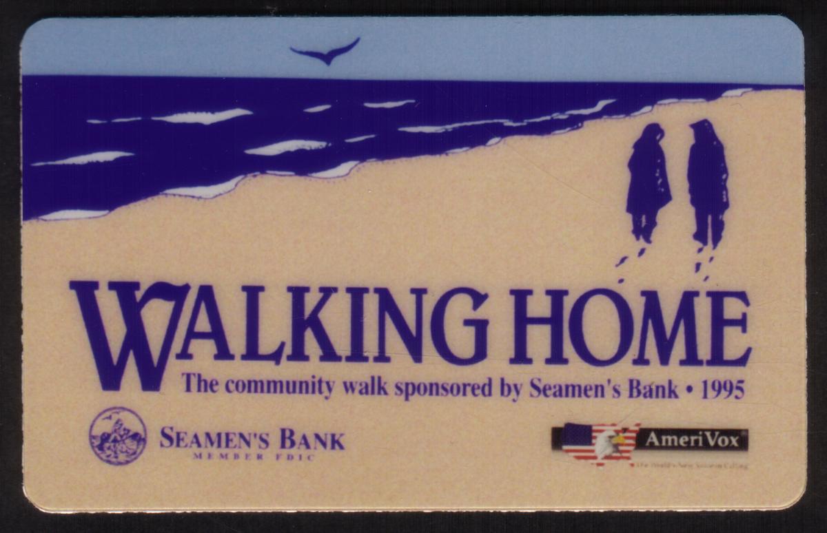 1995 Seamen''s Bank promotional phone card featuring a beach scene, silhouetted figures, bird, and community walk theme, highlighting local banking and coastal connections. |