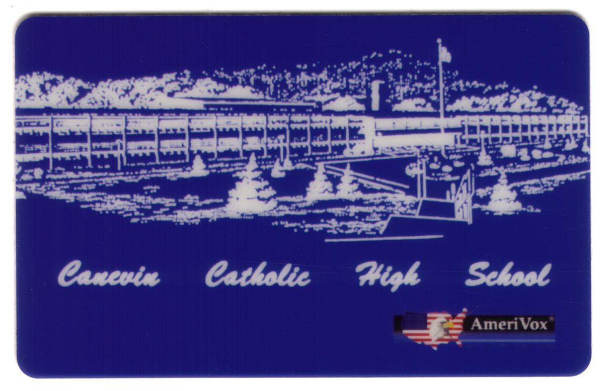 The card has a solid dark blue background that contrasts with the crisp white illustration and script text that reads "Canevin Catholic High School" across the bottom. In the lower right corner, the AmeriVox logo is displayed, consisting of an American flag motif integrated with the AmeriVox name.