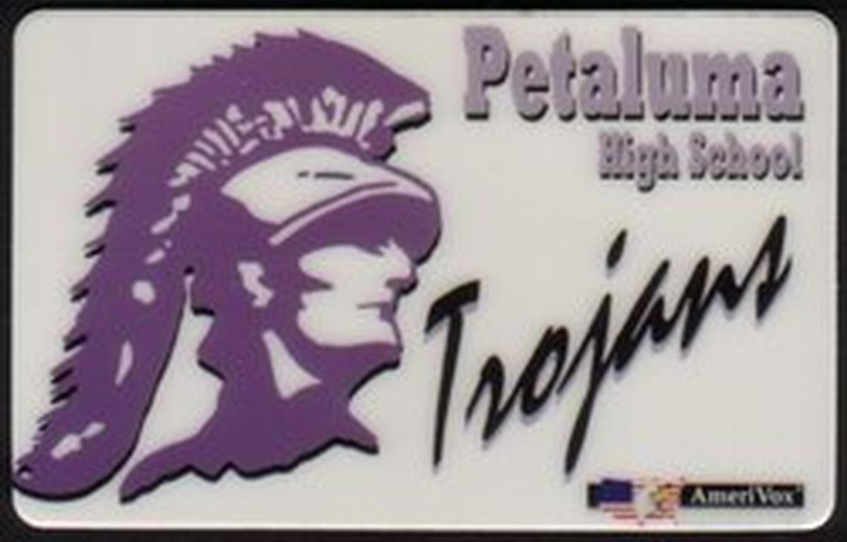 This card is related to high school sports teams and serves as a collectible item representing Petaluma High School’s athletic identity. The use of the Trojan helmet and color scheme reinforces the connection to the Trojans mascot and the competitive spirit associated with the team.