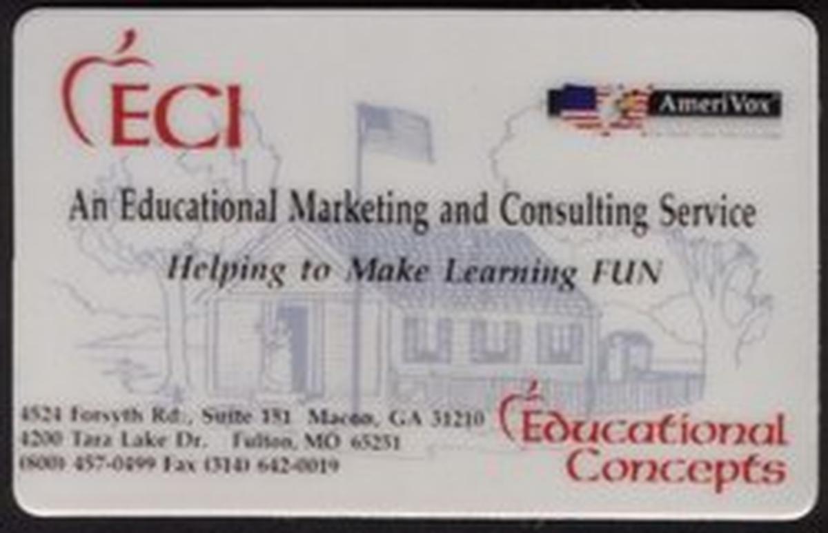 The overall presentation reflects a professional educational marketing service with an emphasis on making learning engaging. The card balances colorful graphics with formal contact and branding information, making it a clear representation of the company Educational Concepts (ECI) based in Fulton, Missouri, and Macon, Georgia.