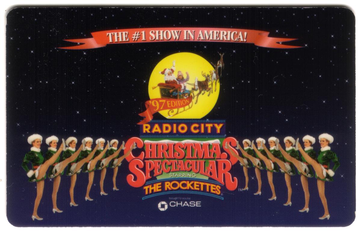 Radio City Music Hall, located in the heart of Manhattan, is a renowned American landmark and symbol of the city's vibrant performing arts scene. The card celebrates the 1997 edition of the Radio City Christmas Spectacular, highlighting the collaboration between the Rockettes and Santa Claus in this beloved seasonal show. The design also features the Chase Bank logo, indicating sponsorship or partnership, and the Cable & Wireless (CWI) branding as the telecommunications provider.