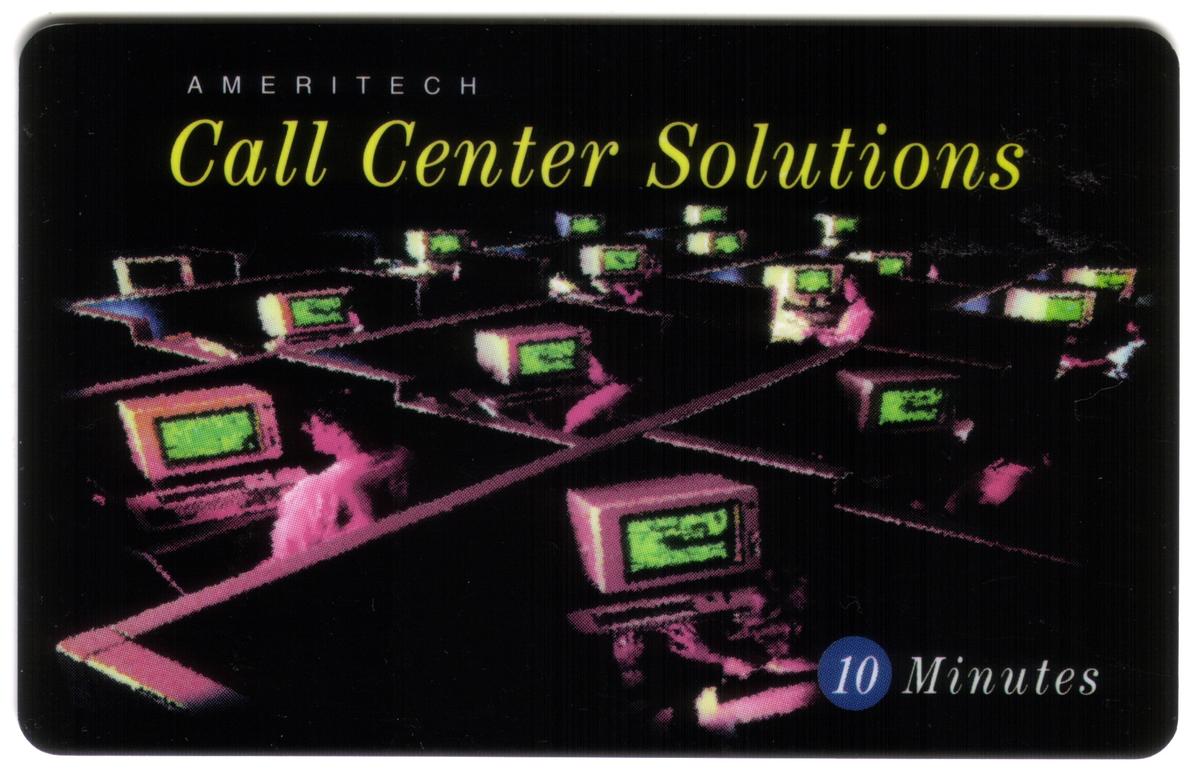 The card displays the Ameritech logo prominently, reinforcing the association with the telecommunications company. The employees are dressed in business casual attire, highlighting a professional workplace environment. The card’s design serves as a representation of Ameritech’s call center operations and their role in customer service and technical support functions.