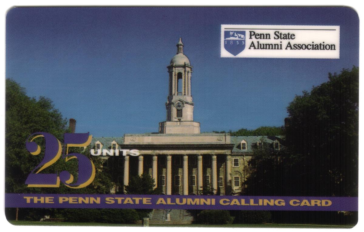 Penn State University alumni phone card featuring Old Main Hall, Penn State logo, 25 units, purple and gold colors, celebrating Penn State’s heritage and pride.