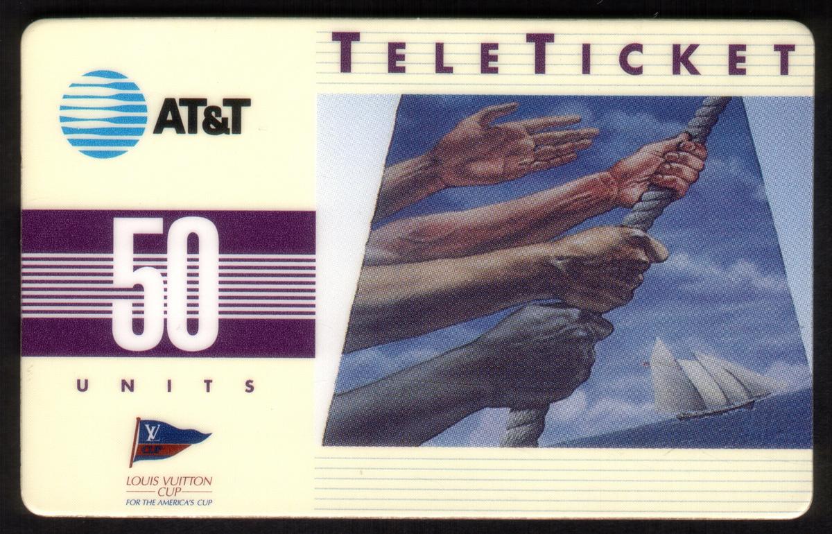 Sailing-themed AT&T 50-unit card featuring Louis Vuitton Cup logo, hands gripping a rope, yacht, and maritime imagery, celebrating competitive sailing and teamwork. |